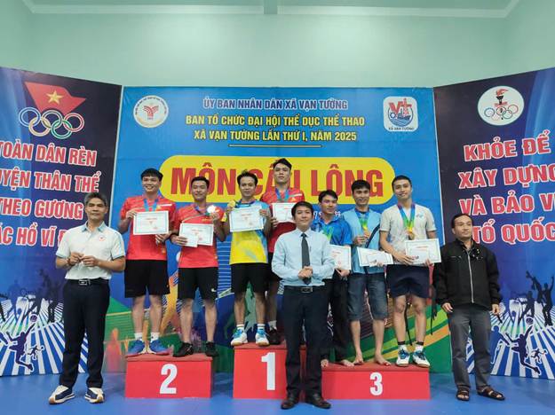 Sau một ngày tranh tài sôi nổi, hấp dẫn và đầy kịch tính, Giải Cầu Lông trong khuôn khổ Đại hội Thể dục Thể thao (TDTT) xã Vạn Tường lần thứ nhất năm 2025 đã thành công tốt đẹp. Ban Tổ chức đã trao các giải Nội dung Đôi Nam Giải Nhất: Trịnh Ngọc Thành và Dương Đình Như Ý (Bình Thuận). Giải Nhì: Nguyễn Phú Tuấn và Bùi Thanh Tây (Đơn vị Bình Thuận). Đồng Giải Ba: Tô Đồng Luân và Võ Ngọc Hiếu (Bình Trị), Nguyễn Thanh Tuấn và Ưng Ngọc Qúy (Bình Trị).
