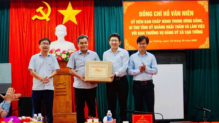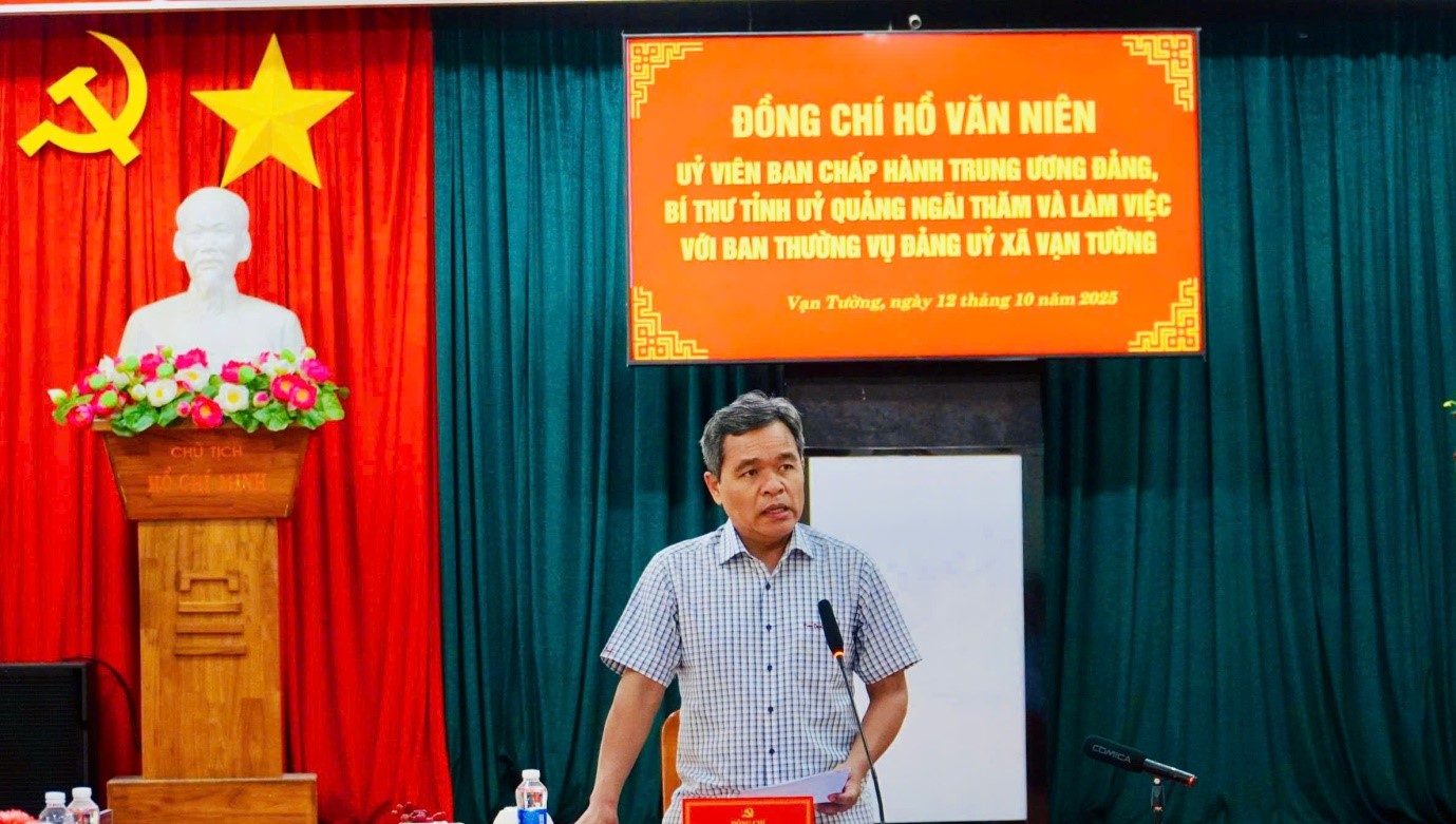 Sáng ngày 12/10/2025, tại Hội trưởng Đảng uỷ xã Vạn Tường, Ủy viên Trung ương Đảng, Bí thư Tỉnh ủy Quảng Ngãi Hồ Văn Niên đã có buổi làm việc với Ban Thường vụ Đảng ủy xã Vạn Tường về tình hình thực hiện các nhiệm vụ năm 2025. Cùng dự có Ủy viên Ban Thường vụ Tỉnh ủy, Trưởng Ban Tổ chức Tỉnh ủy Lữ Ngọc Bình; Ủy viên Ban Thường vụ Tỉnh ủy, Trưởng Ban Nội chính Tỉnh ủy Trương Thị Linh; Ủy viên Ban Thường vụ Tỉnh ủy, Trưởng Ban Quản lý Khu kinh tế Dung Quất và các Khu công nghiệp tỉnh Lương Kim Sơn; Phó Chủ tịch UBND tỉnh Đỗ Tâm Hiển và lãnh đạo các sở, ngành của tỉnh.