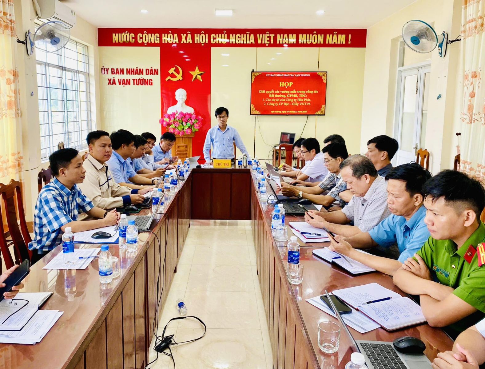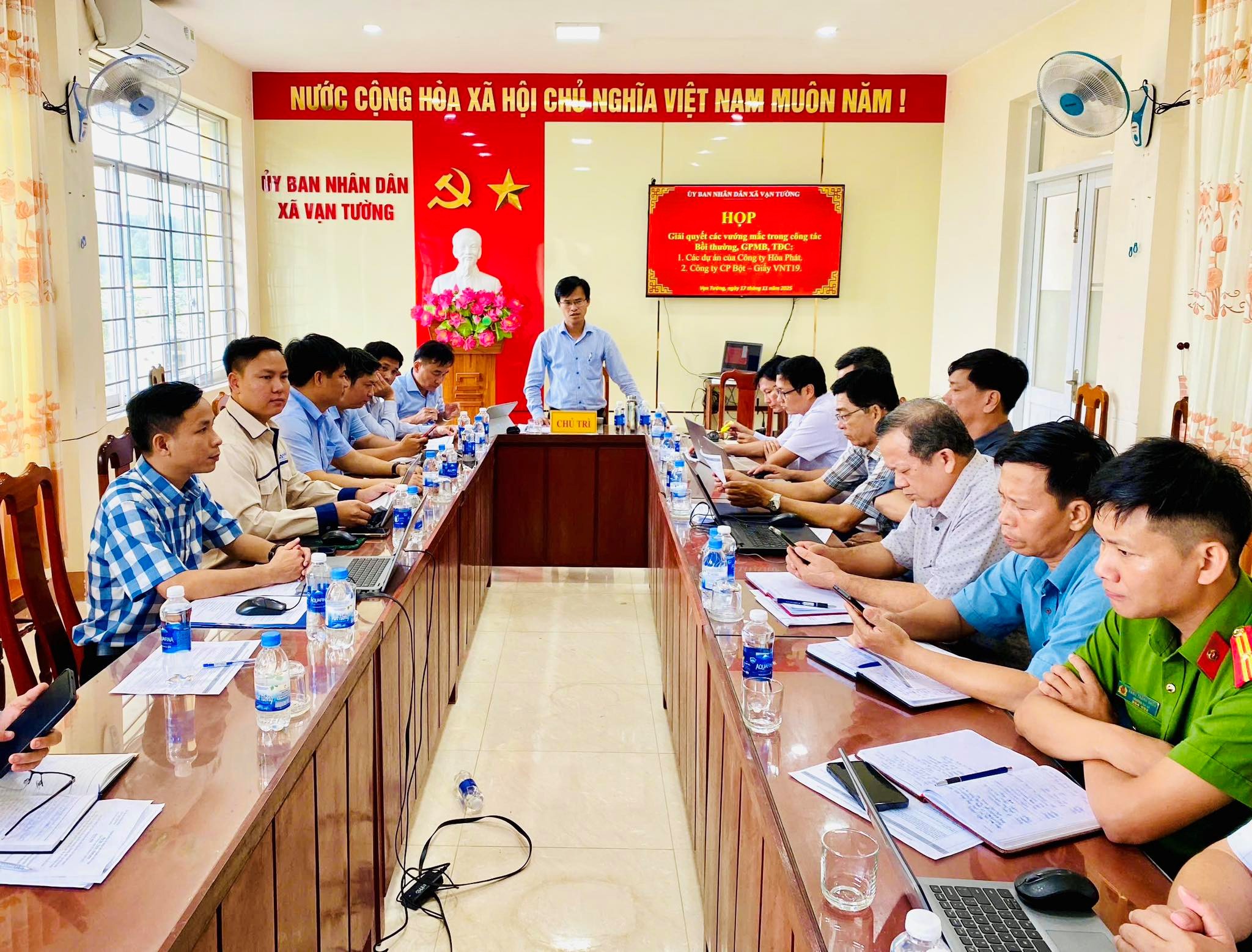 Chiều ngày 17/11/2025, tại Trụ sở UBND xã Vạn Tường, đồng chí Ung Đình Hiền, Chủ tịch UBND xã đã chủ trì cuộc họp giải quyết các vướng mắc, trong công tác bồi thường giải phóng mặt bằng, tái định cư các Dự án Hòa Phát Dung Quất và vướng mắc liên quan đến tuyến ống nước thải sau xử lý của Công ty cổ phần Bột Giấy VNT19.