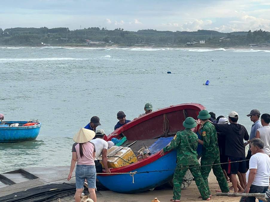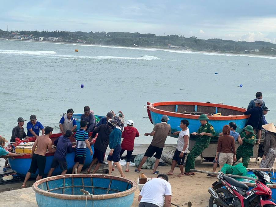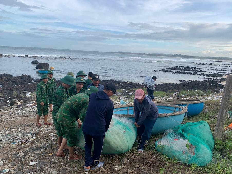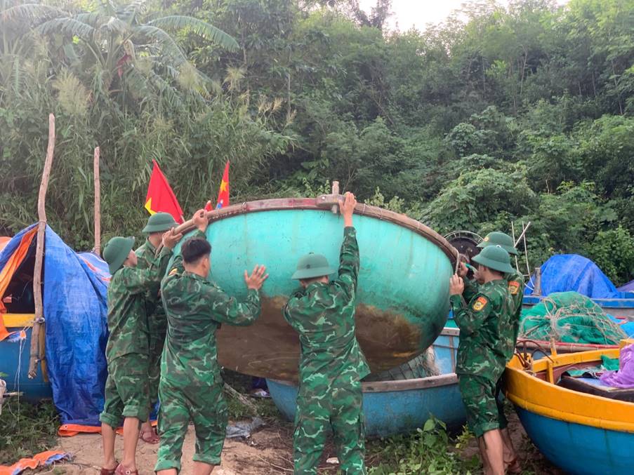 Lực lượng Biên phòng Bình Hải giúp ngư dân di chuyển thúng, ngư lưới cụ chủ động ứng phó bão số 13 (Kalmaegi)