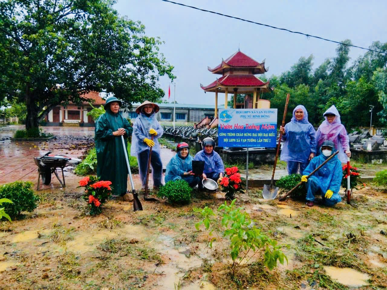 Chào mừng Đại hội đại biểu Phụ nữ xã Vạn Tường lần thứ Nhất, nhiệm kỳ 2025-2030, các chi hội đã dâng lên một công trình mang ý nghĩa sâu sắc: "Vườn hoa tưởng niệm" tại Nghĩa trang Liệt sĩ Bình Đông. Đây là ý tưởng chung tay của bốn chi hội Phụ nữ Bình Đông cũ. Chỉ từ 4 triệu đồng tiền quỹ và hàng trăm ngày công lao động miệt mài của hội viên và cán bộ chiến sĩ, vùng đất hơn 300m² khô cằn đã được hồi sinh, phủ lên bằng những luống hoa rực rỡ, trang nghiêm. Công trình này không chỉ là hành động tri ân mà còn thể hiện tinh thần "Uống nước nhớ nguồn" sâu sắc của phụ nữ Vạn Tường.